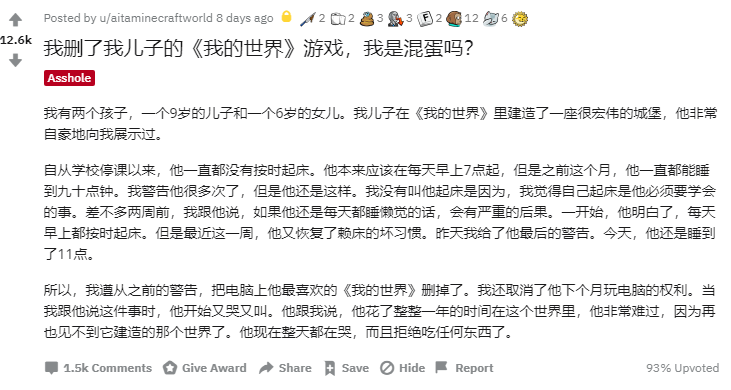 前几天,有个家长因为9岁的儿子总是不听话不能按时起床,删掉了儿子玩了一年的《我的世界》,儿子得知后整日大哭并拒绝吃饭。他发贴讲了这件事,并发出疑问“我是混蛋吗?”