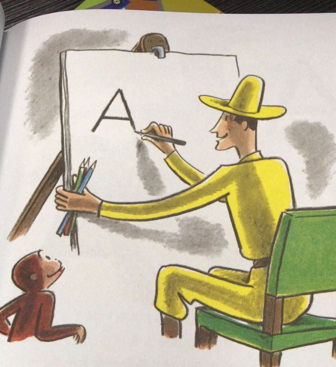 黄帽子叔叔先在画板上写下了“A”,