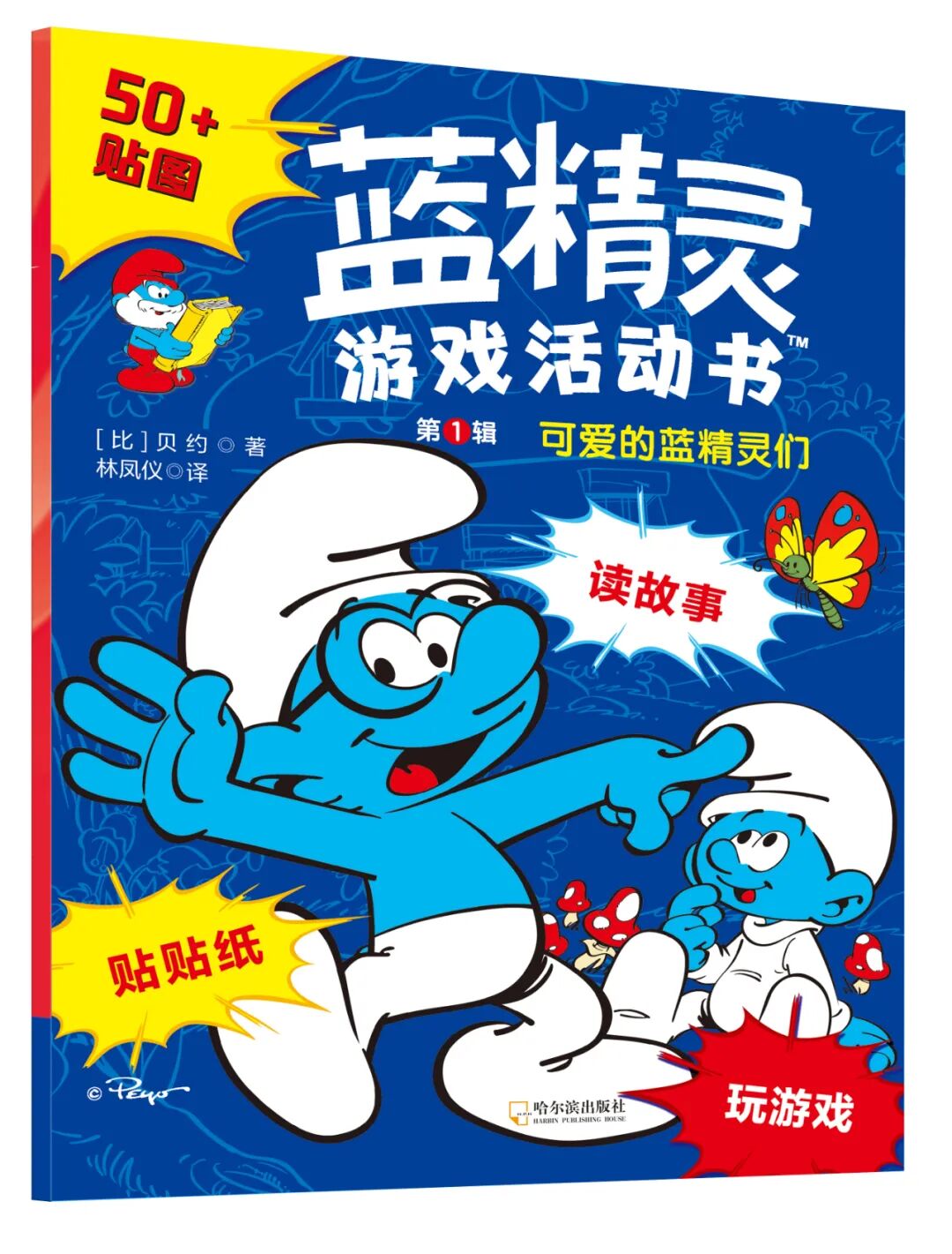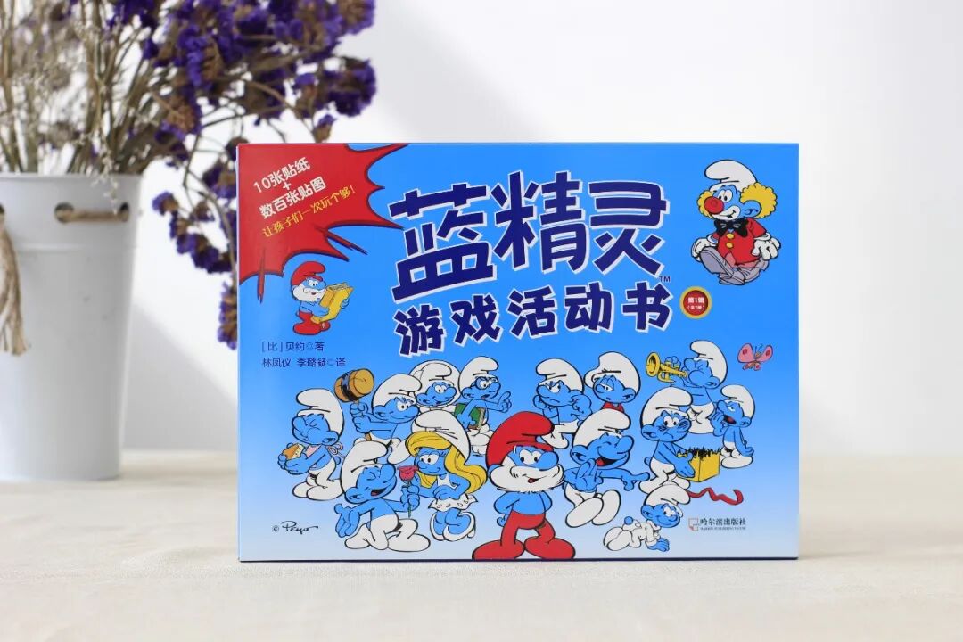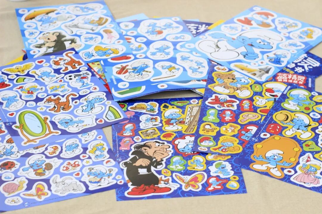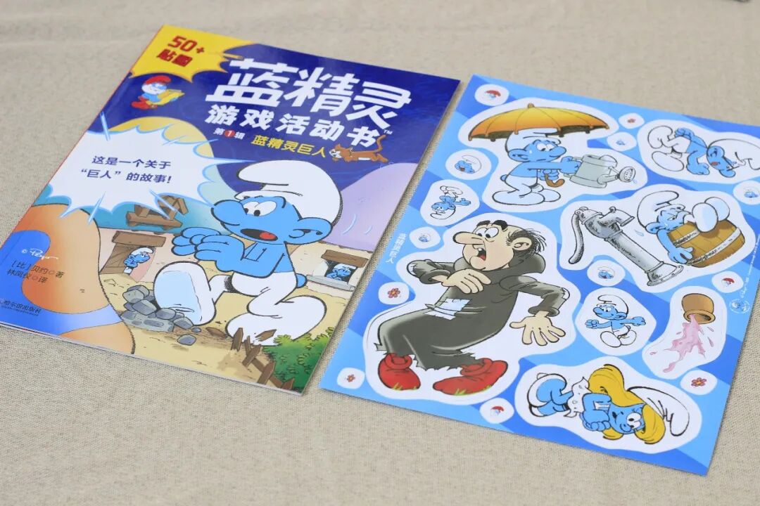 贴纸故事书2册,分别是《可爱的蓝精灵们》,关于角色与性格,《蓝宝宝出现啦》关于小孩和玩具。