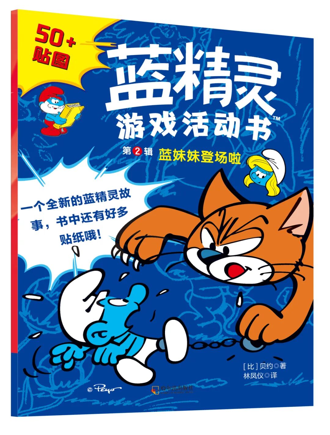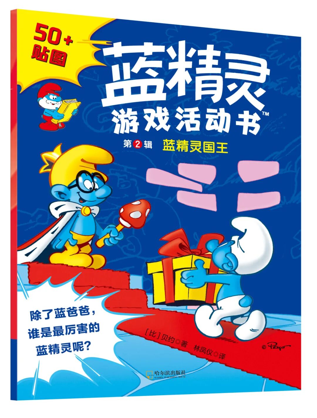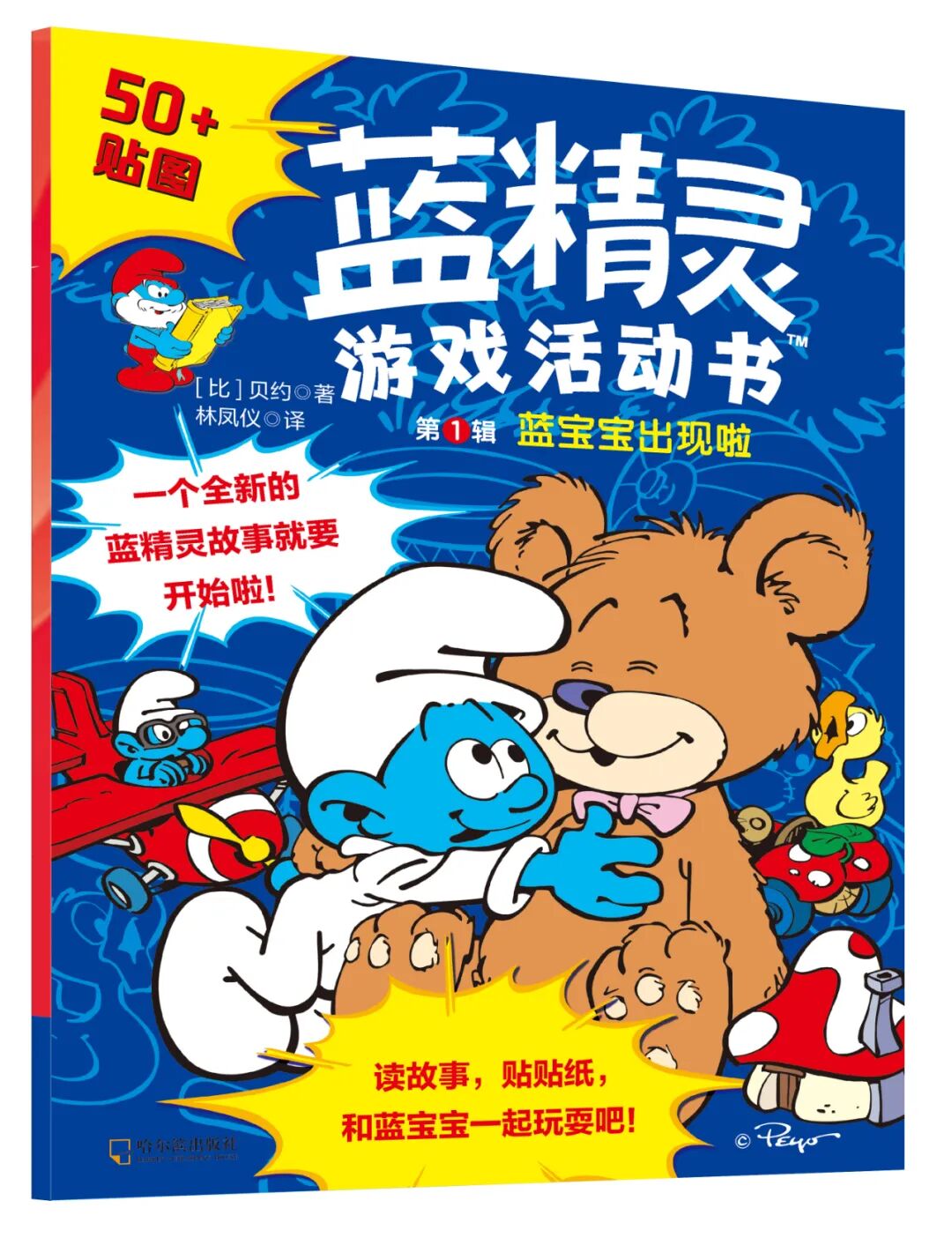 贴纸故事书2册,分别是《可爱的蓝精灵们》,关于角色与性格,《蓝宝宝出现啦》关于小孩和玩具。
