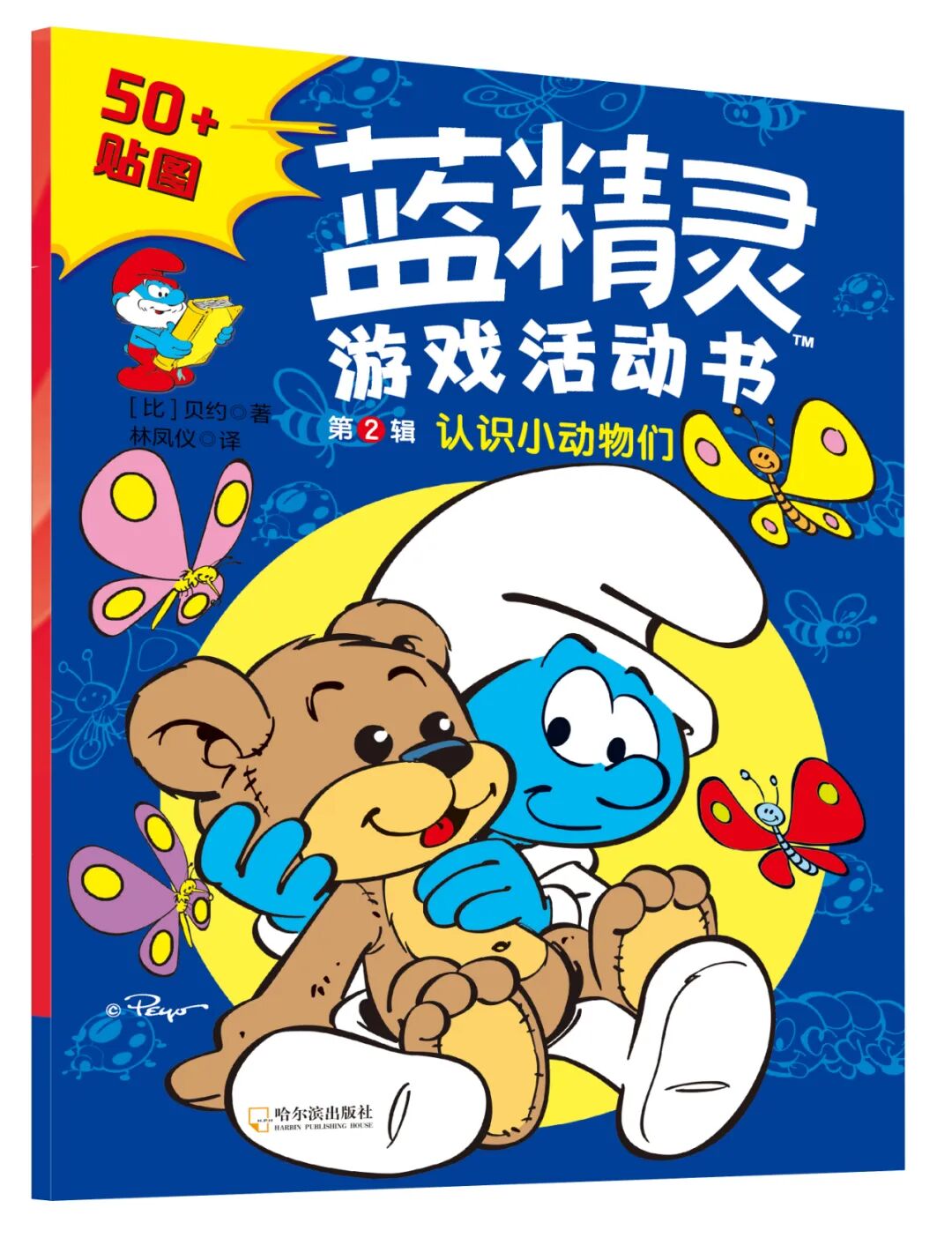 贴纸游戏书3册,分别是《蓝妹妹登场啦》,关于团结友爱;《蓝精灵国王》关于知错能改;还有《认识小动物》,关于认识动物们。